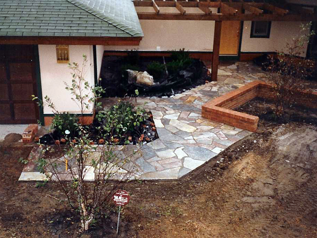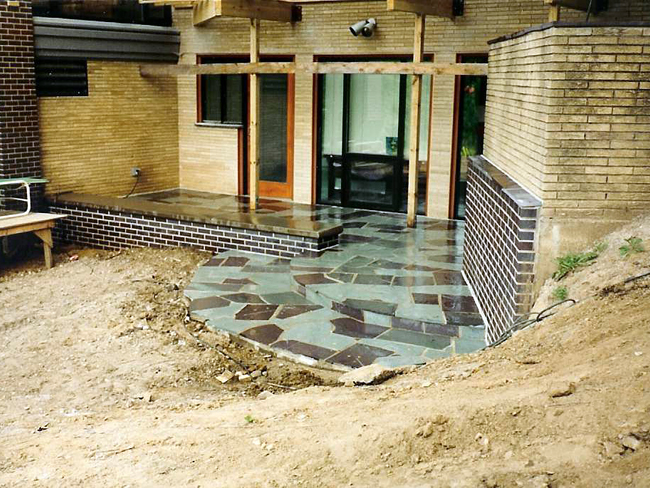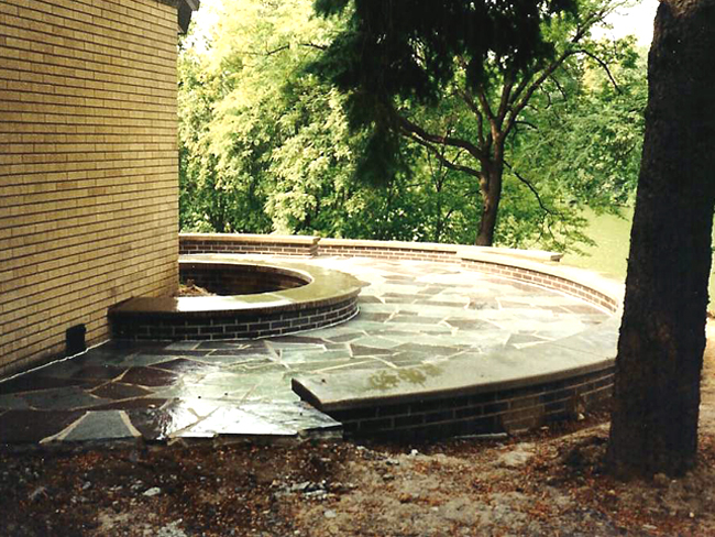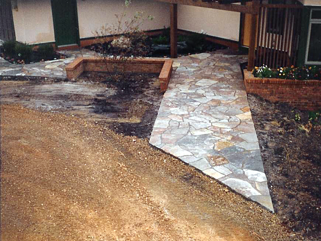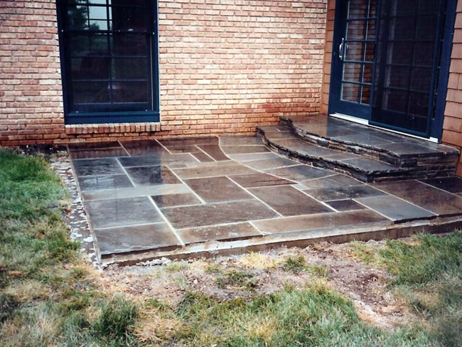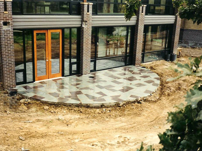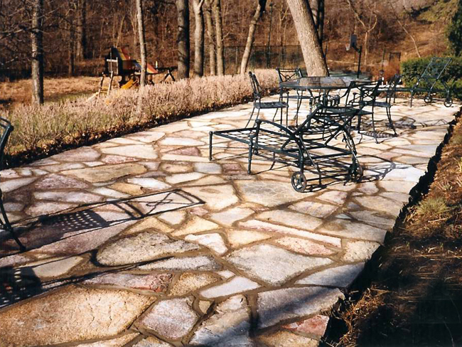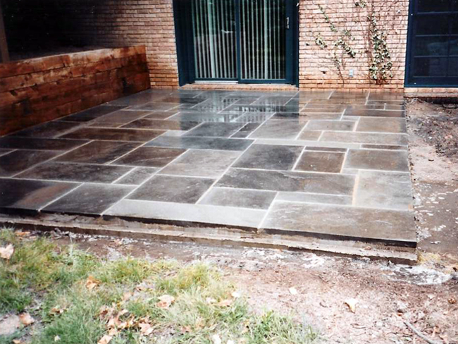 Cox Concrete will install the natural stone in a horizontal fashion on pool decks, patios and walks. Typically this is done in a bed of mortar on top of a reinforced concrete slab base. This technique provides a rigid surface upon which to apply the natural stone.